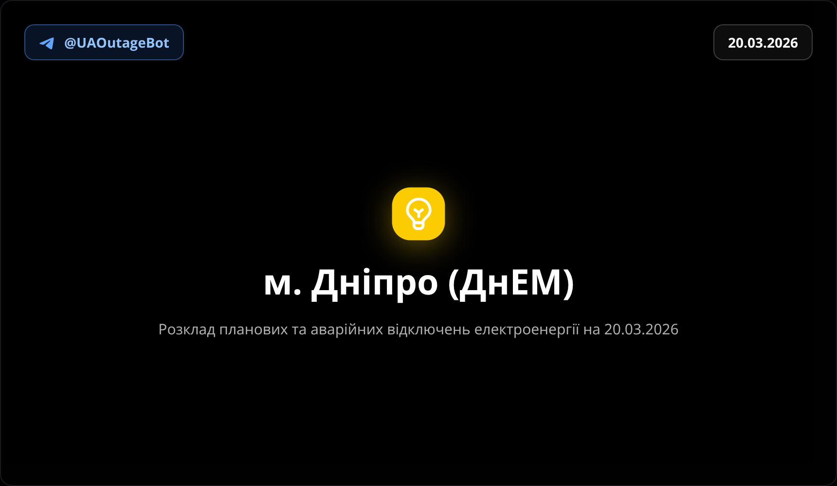 Розклад планових та аварійних відключень електроенергії м. Дніпро (ДнЕМ) на 20.03.2026. Усі черги та актуальні дані для планування дня.